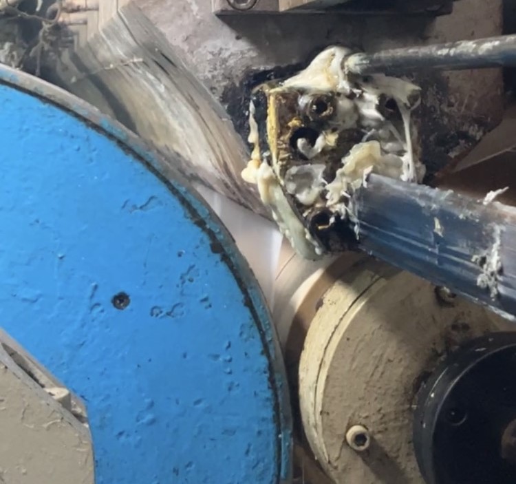 ③液体をフレキシブルコンテナの原反表面に、圧をかけながら接着していきます。