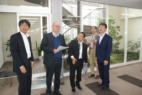 当社が自然エネルギー信州ネットに加盟しているご縁で長野県環境部から依頼があり、ドイツ連邦共和国より産官学民による再生可能エネルギー連携組織である「deENet」Kilpper所長がご来社されて、在ドイツ連邦共和国日本大使館の川又参事官、長野県環境部の方々と環境配慮型設備と太陽光発電システム研究棟をご視察されました。